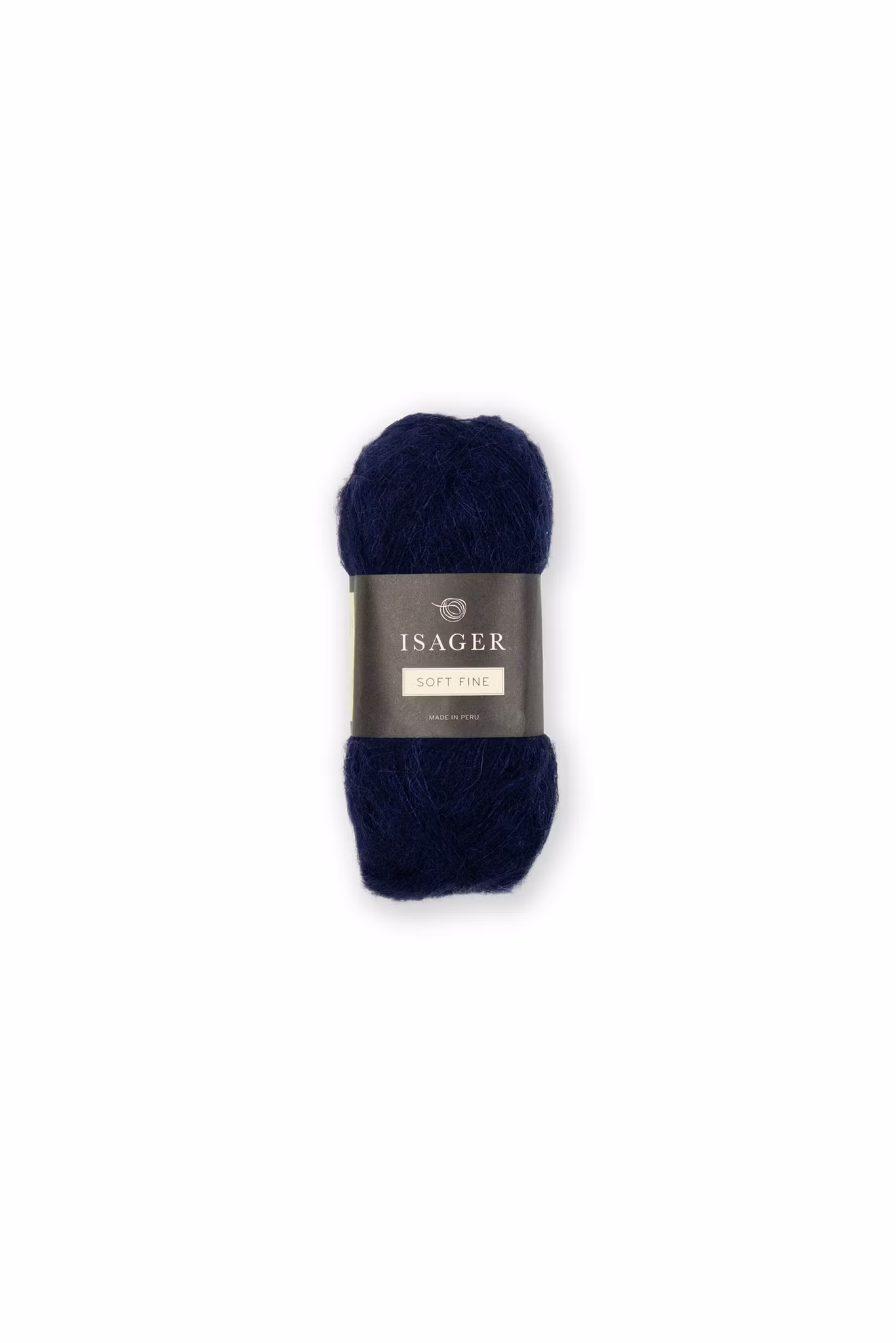 Isager Soft Fine är en tunnare variant av Soft med lite annorlunda innehåll och uppbyggnad. Soft Fine består av en silkeskärna med en tråd alpacka/yak som har borstats upp. Lika mjuk som Soft. Soft fine är ett utmärkt alternativ om man vill sticka fluffiga och mjuka plagg men inte vill sticka med dubbel tråd Silk Mohair.