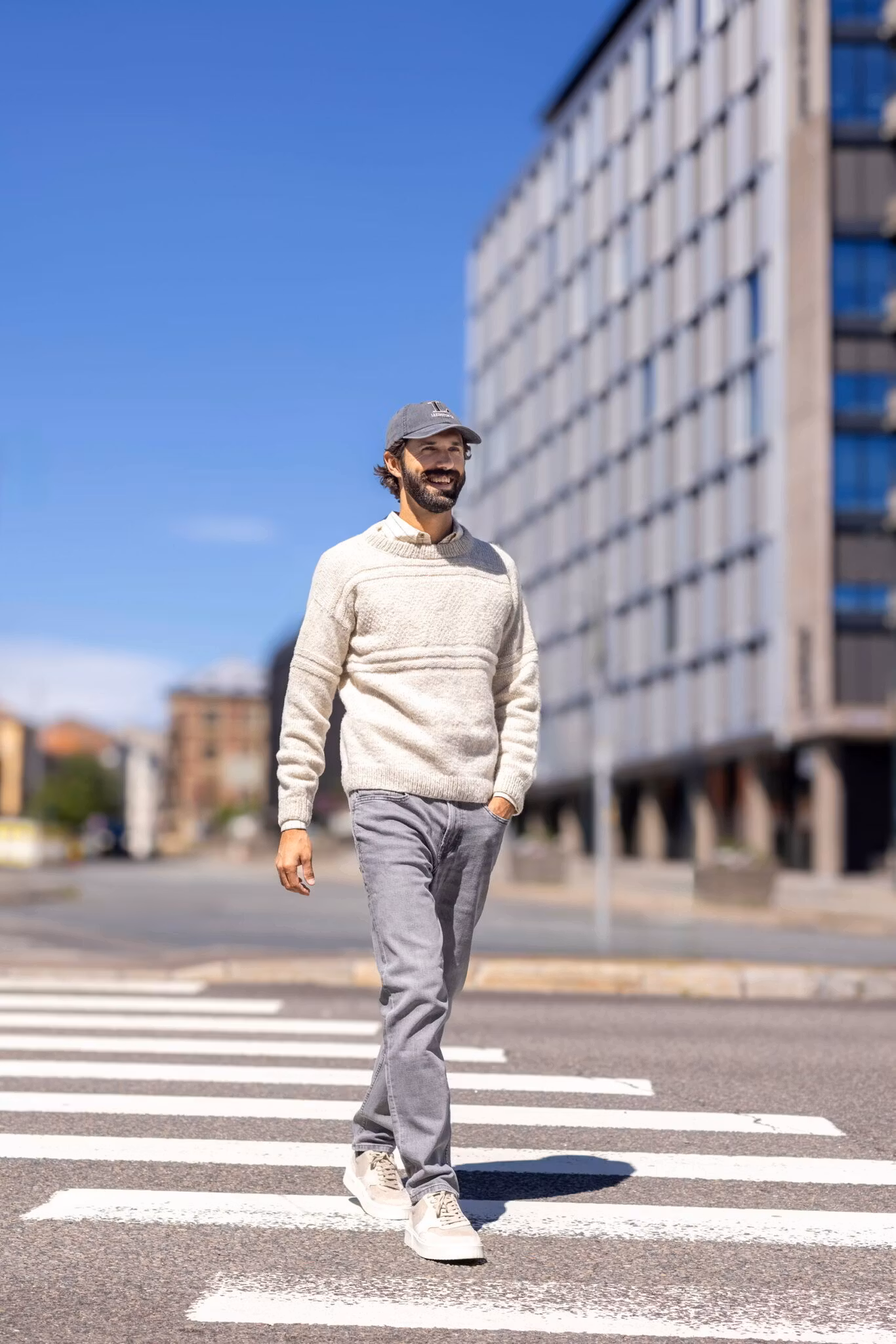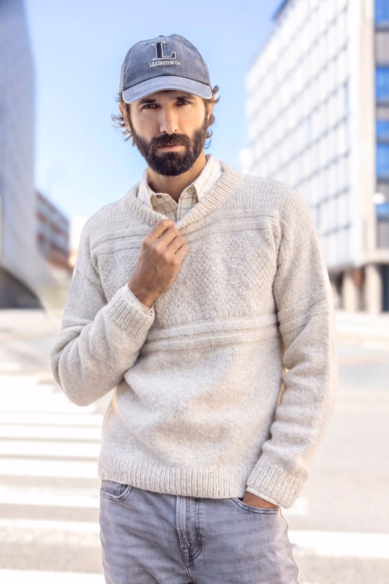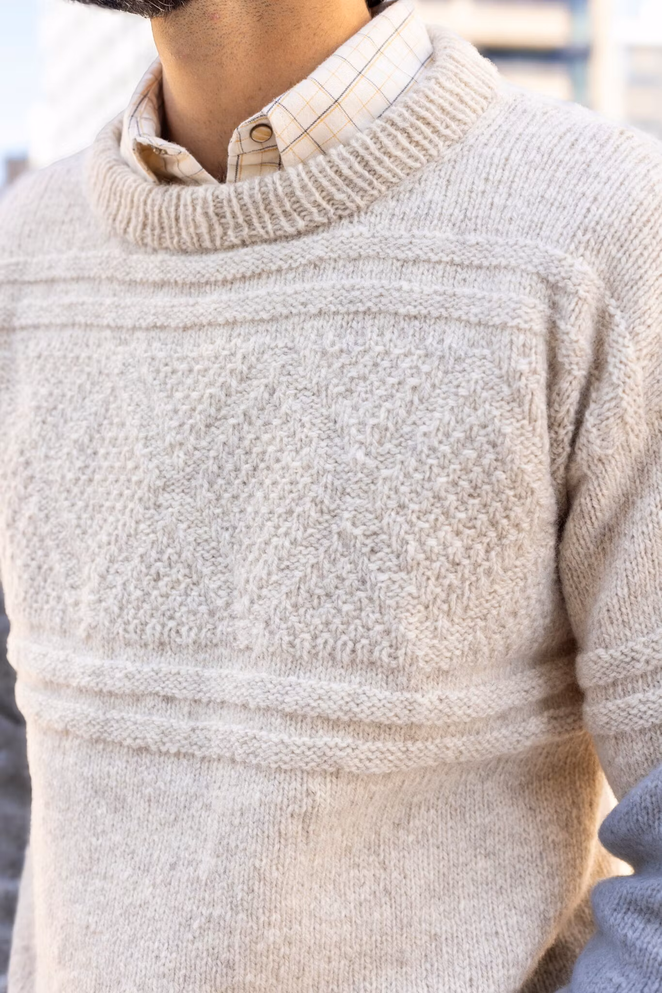 Tröjan Oliver stickas uppifrån och ned med slätstickning samt strukturmönster på bröstkorgen.